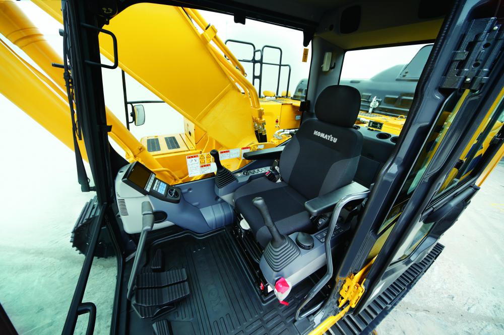 国内の販売機種では初めてKomVision(一般建機用周囲監視システム)を標準装備。機械側面と後方に配置した4台のカメラを用いて、機械周囲をモニタ上に表示することができます。