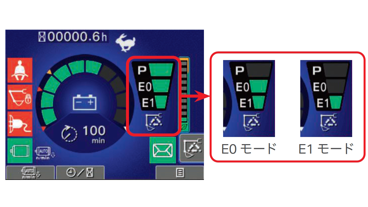 作業内容に応じて、「P」「E0」「E1」の3つの作業モードをモニターパネルで簡単に選択できます。