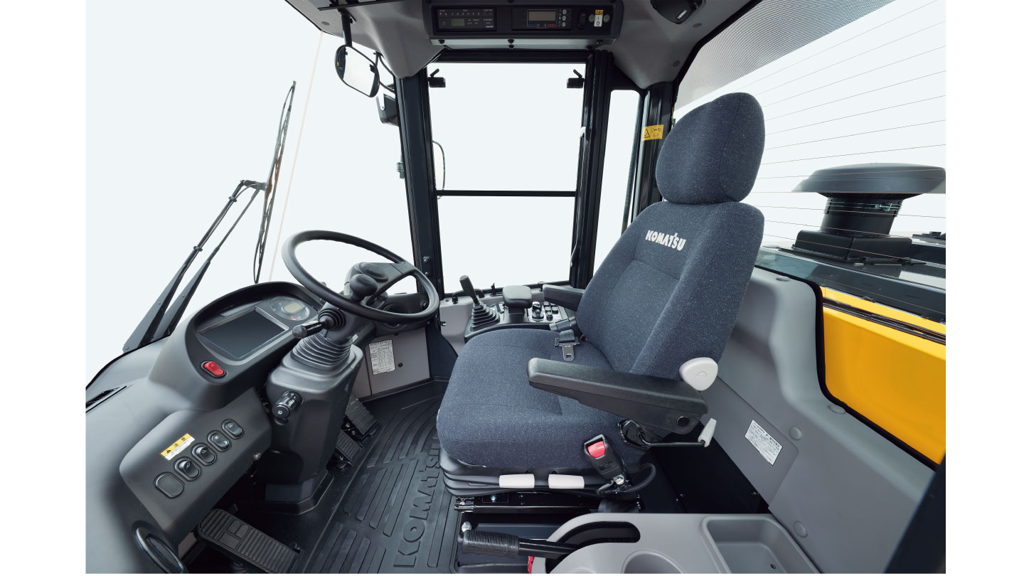 定評のある、静かえワイドな視界を確保した大型ピラーレスキャブを採用。さらに、万が一の場合でもオペレーターの安全を確保するROPS/FOPSを満たしています。
