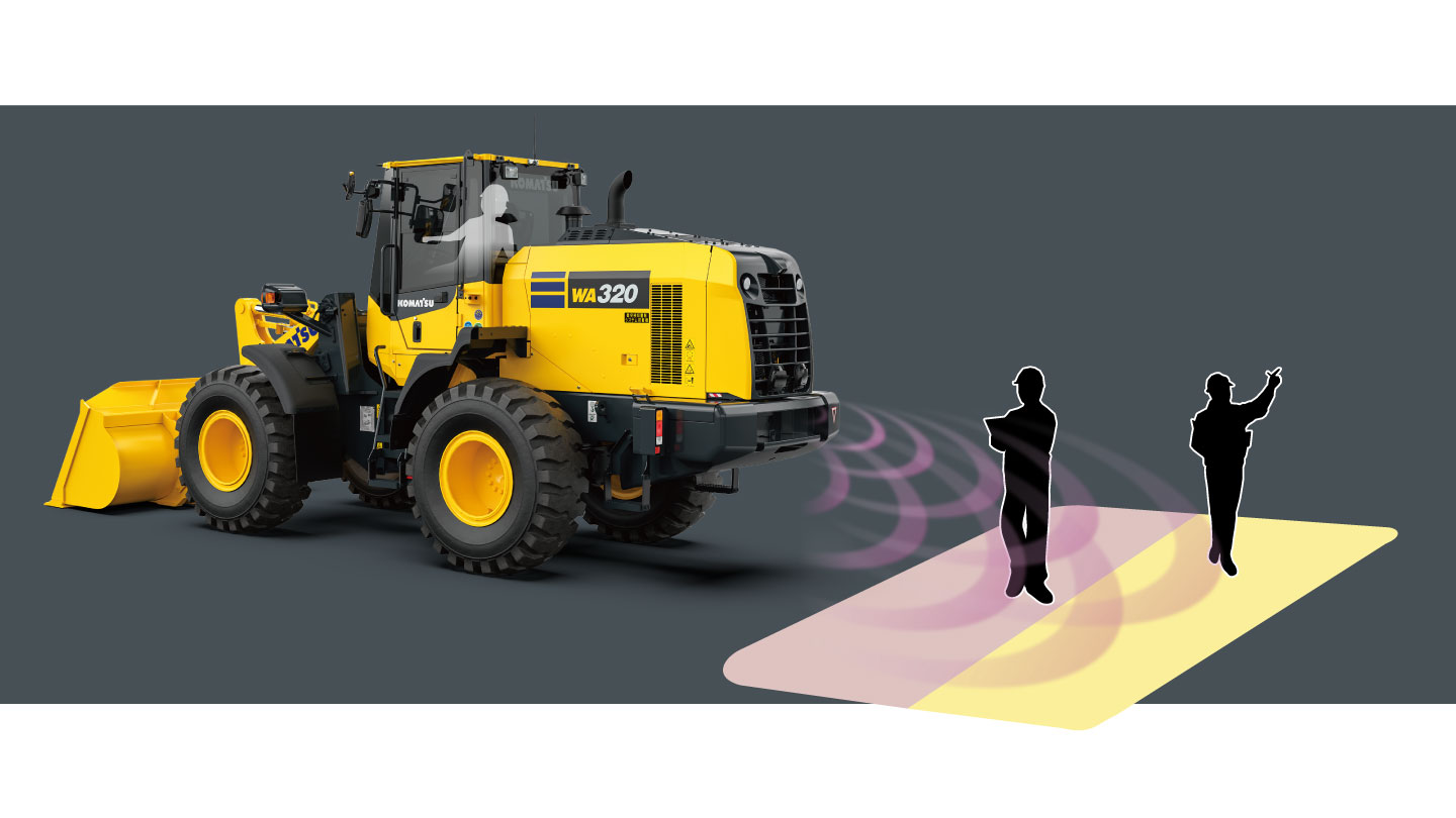 後進時に車両後方の障害物を準ミリ波レーダーで検知し、キャブ内のオペレーターに障害物の接近を音と表示灯でお知らせします。また、ホイールローダー向けに開発した誤検知低減機能を備え、生産性は従来そのままに安全性を向上。