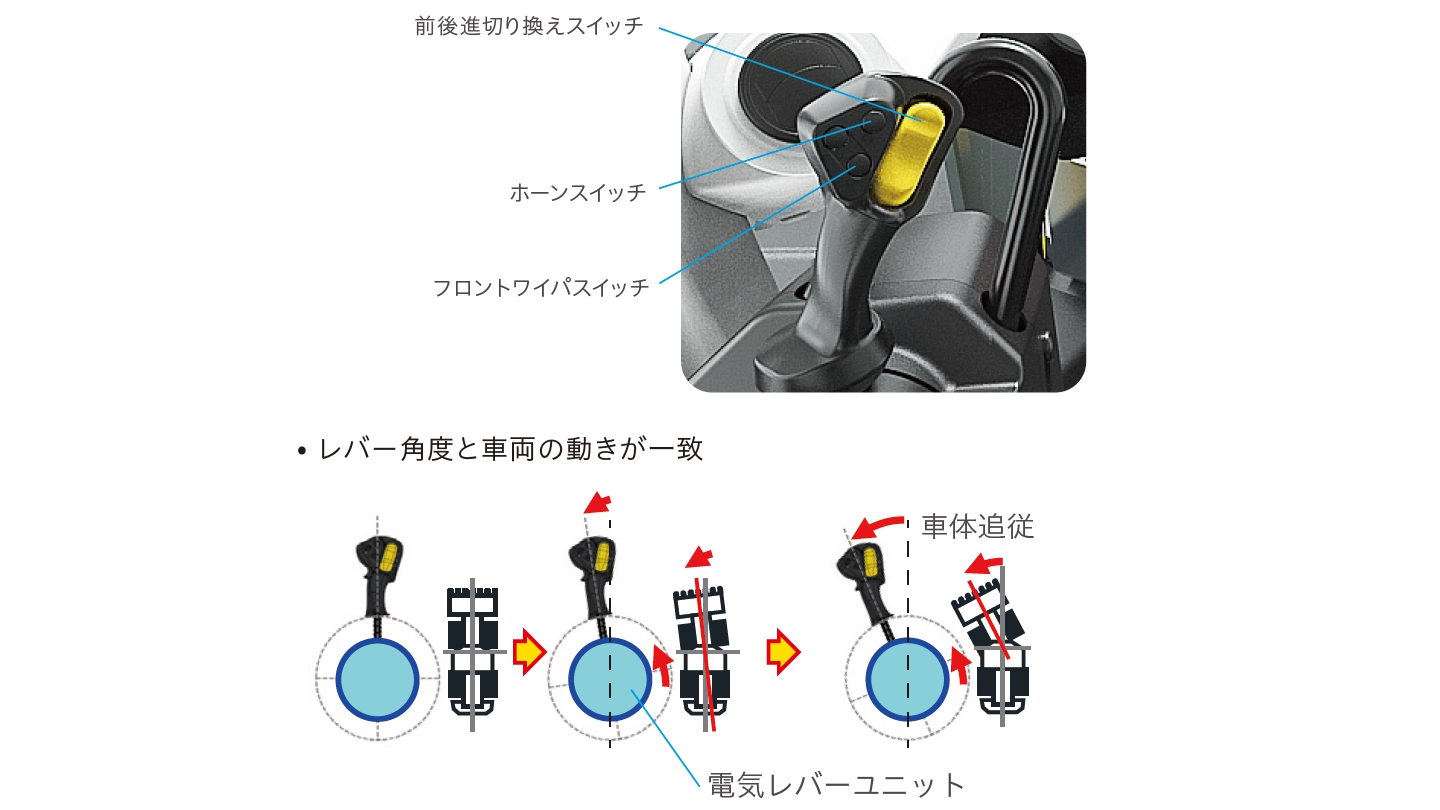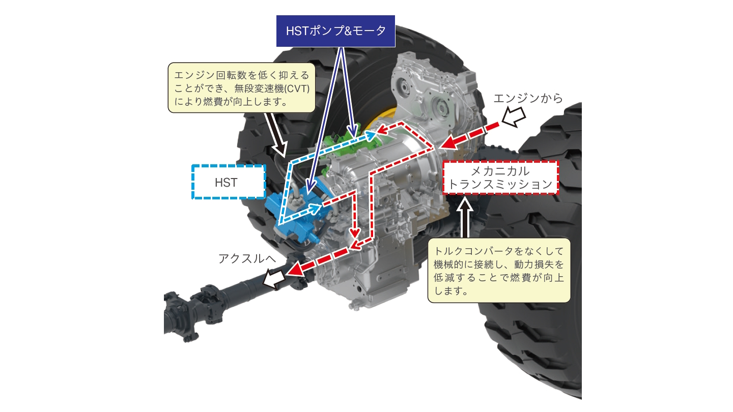 トランスミッションには操作性の高い可変容量油圧ポンプ&モータを使用した、無段変速を可能とするハイドロスタティックトランスミッション(HST)と、高効率なメカニカルトランスミッションを組み合わせたHMTに、コマツ独自の技術を詰め込んだコマツハイドロリックメカニカルトランスミッション(KHMT)を採用。