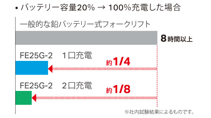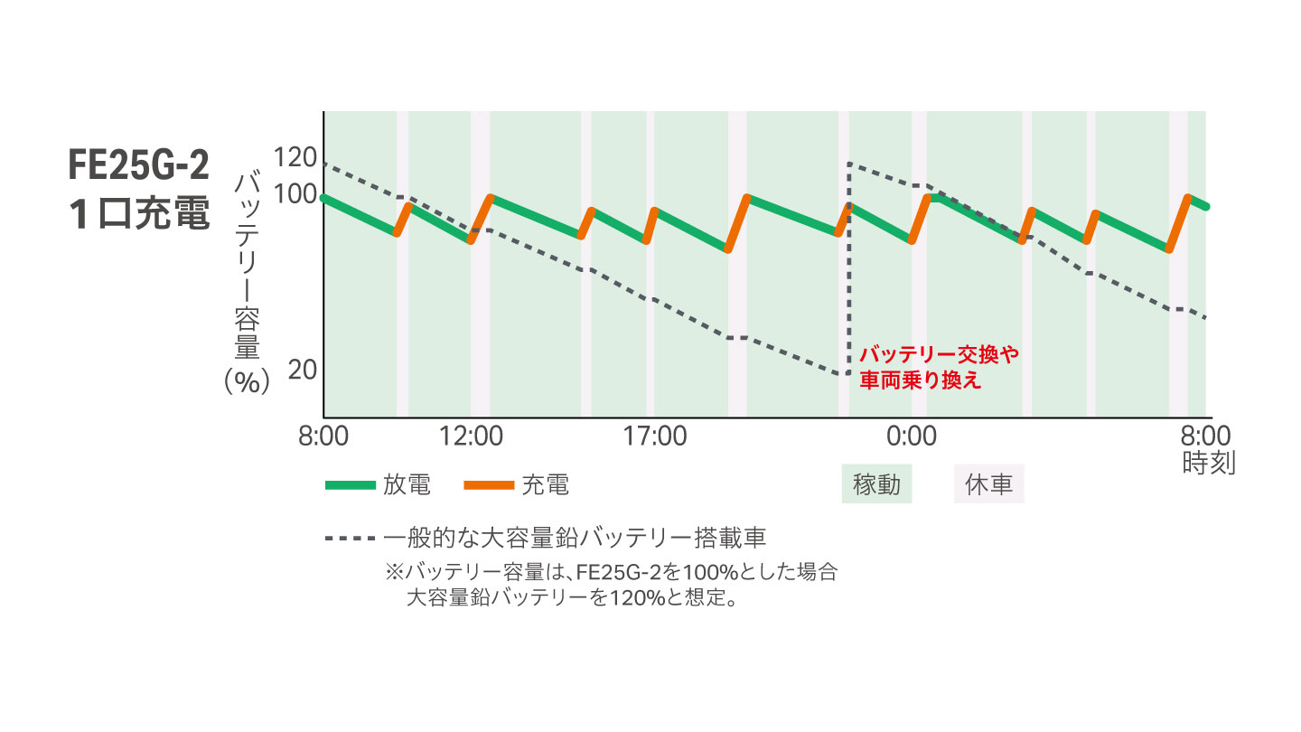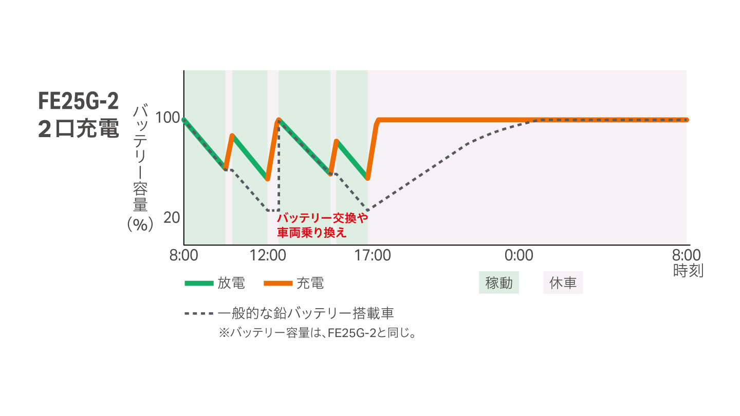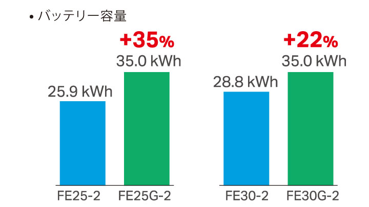 FEシリーズに大容量リチウムイオンバッテリーを搭載し、 走行性能・安全性能に加え、長時間稼働が可能に。