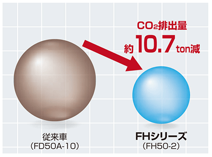 ※当社同クラストルクコンバータ方式車両比、当社テストコース時。稼動時間は5時間/日、300日/年、CO2排出係数は経済産業省・国土交通省共同ガイドライン(平成18年4月)によって計算。実際の作業では、作業内容により上記以外になる場合があります。