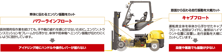 運転席はもちろん、マスト、フォーク、ハンドルや操作レバーの振動を低減