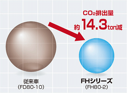 ※当社同クラストルクコンバータ方式車両比、当社テストコース時。稼動時間は5時間/日、300日/年、CO2排出係数は経済産業省・国土交通省共同ガイドライン(平成18年4月)によって計算。実際の作業では、作業内容により上記以外になる場合があります。