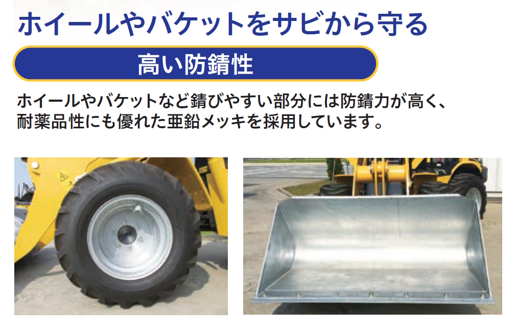 <ホイールやバケットをサビから守る> ホイールやバケットなど錆びやすい部分には防錆力が高く、耐薬品性にも優れた亜鉛メッキを採用しています。