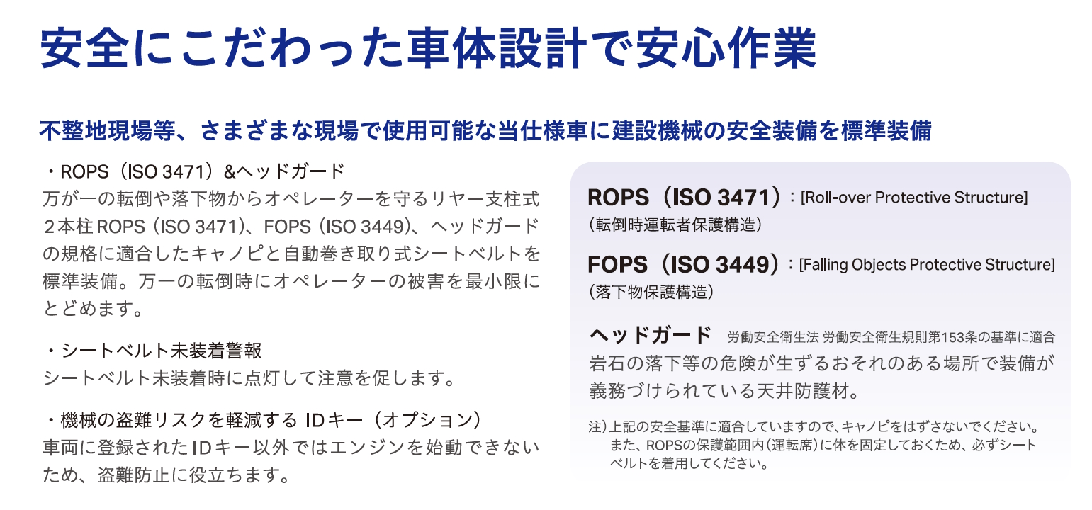 不整地現場等、さまざまな現場で使用可能な当仕様車に建設機械の安全装備を標準装備