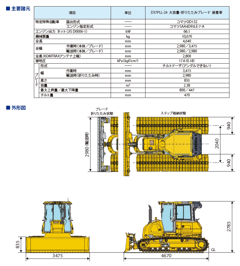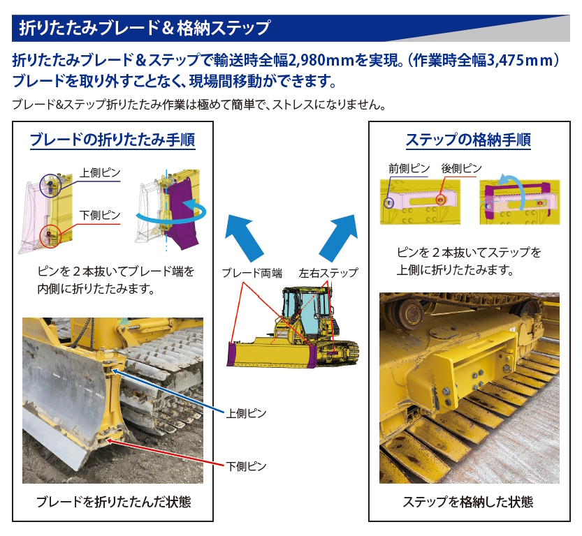 - 折りたたみブレード&ステップで輸送時全幅2,980mmを実現。(作業時全幅3,475mm)