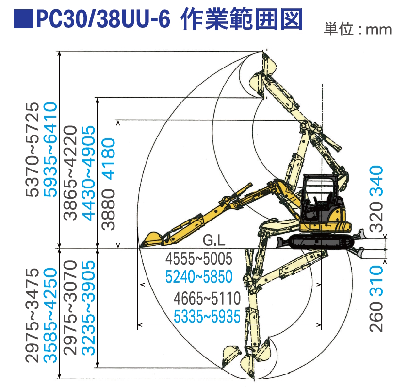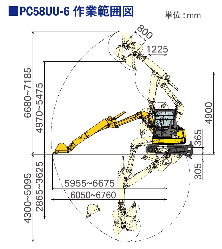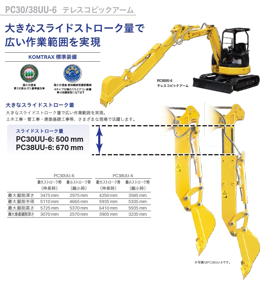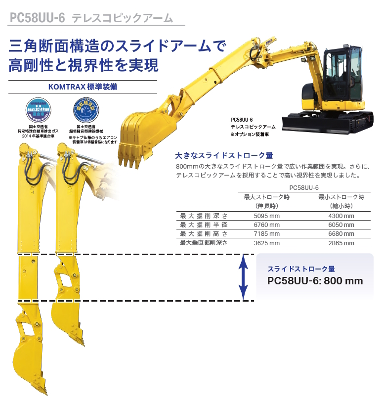<大きなスライドストローク量> 広い作業範囲を実現。 PC30UU-6:500mm PC38UU-6:670mm PC58UU-6:800mm