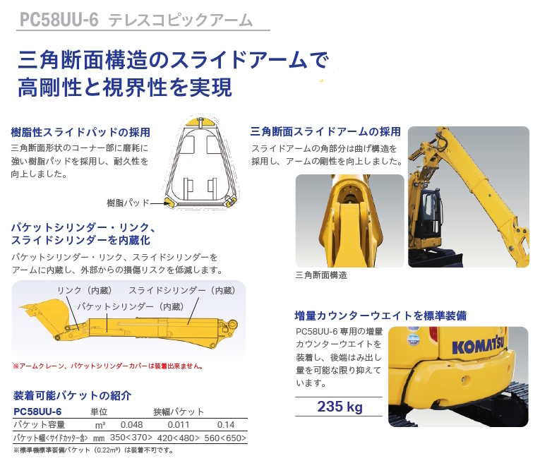 <三角断面スライドアームの採用> スライドアームの角部分は曲げ構造を採用し、アームの剛性を向上。(PC58UU-6)