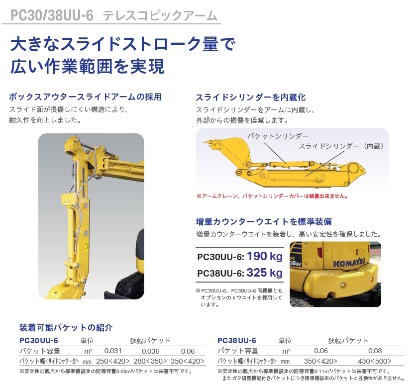 <ボックスアウタースライドアームの採用> スライド面が損傷しにくい構造により、耐久性を向上。(PC30UU-6/PC38UU-6)