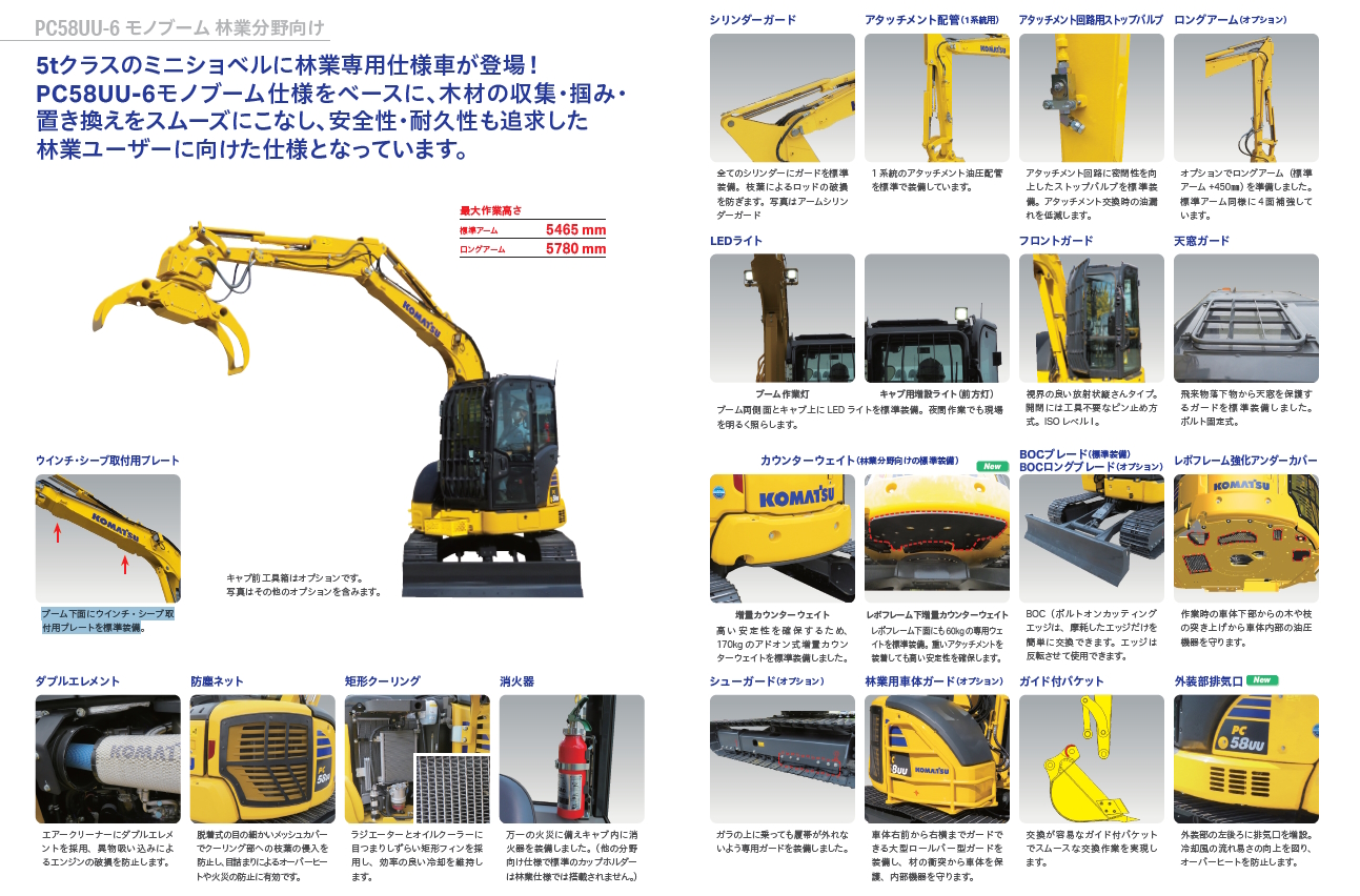 - 主なオプション:林業用車体ガード、4面補強ロングアーム、ボルトカッティングエッジロングブレード、キャブ前工具箱