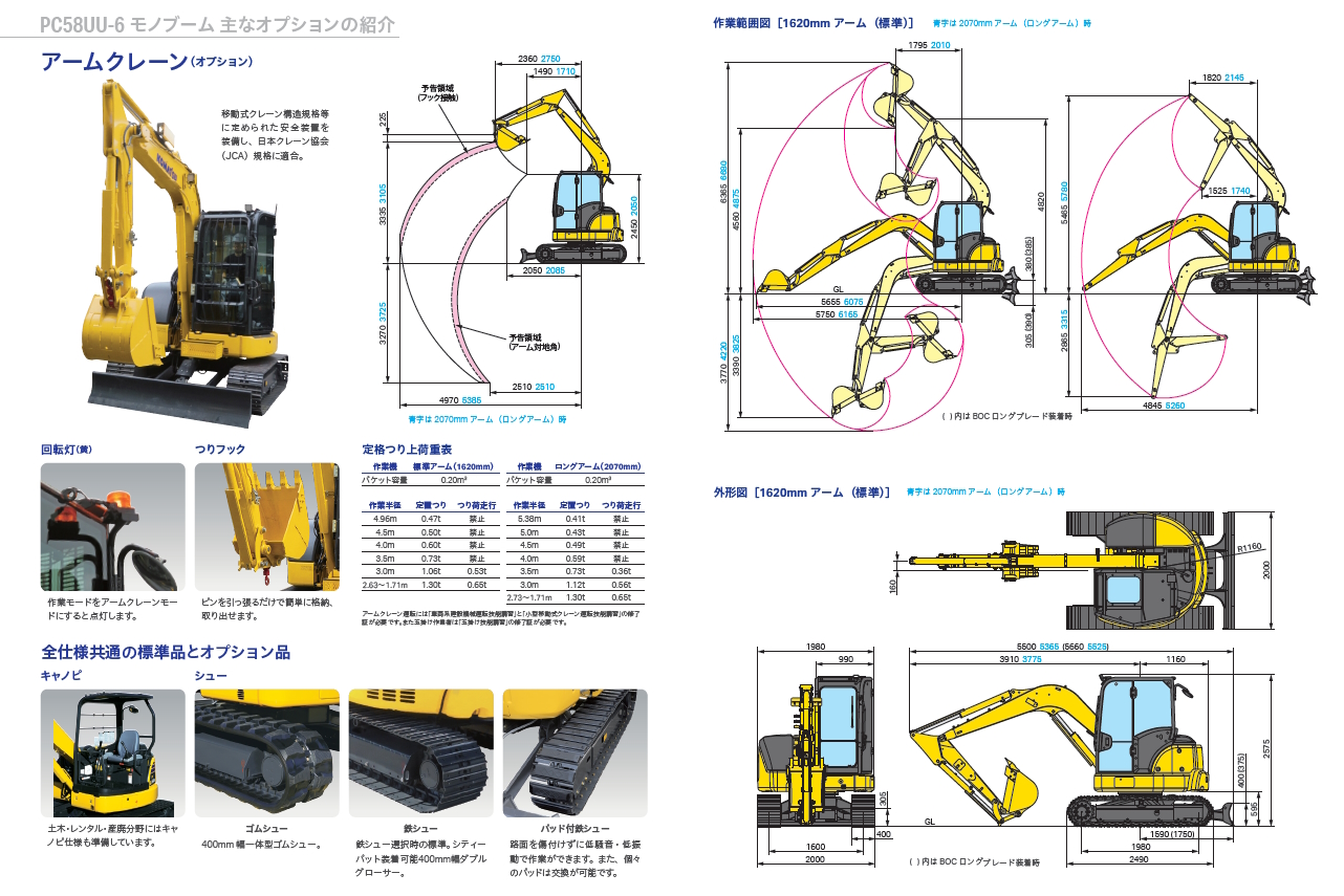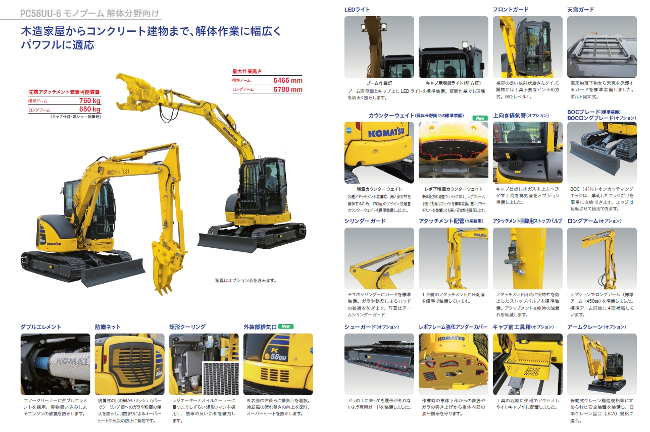 - 主なオプション:アームクレーン仕様、4面補強ロングアーム、ボルトカッティングエッジロングブレード、上向き排気管、キャブ前工具箱