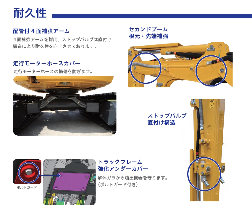 ボルトガード付きトラックフレーム強化アンダーカバー装着により、解体ガラから油圧機器を守ります。
