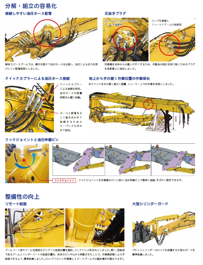 - 接続しやすい油圧ホース配管、圧抜きプラグ、クイックカプラーによる油圧ホース接続、フックジョイントと油圧伸縮ピン等を採用。