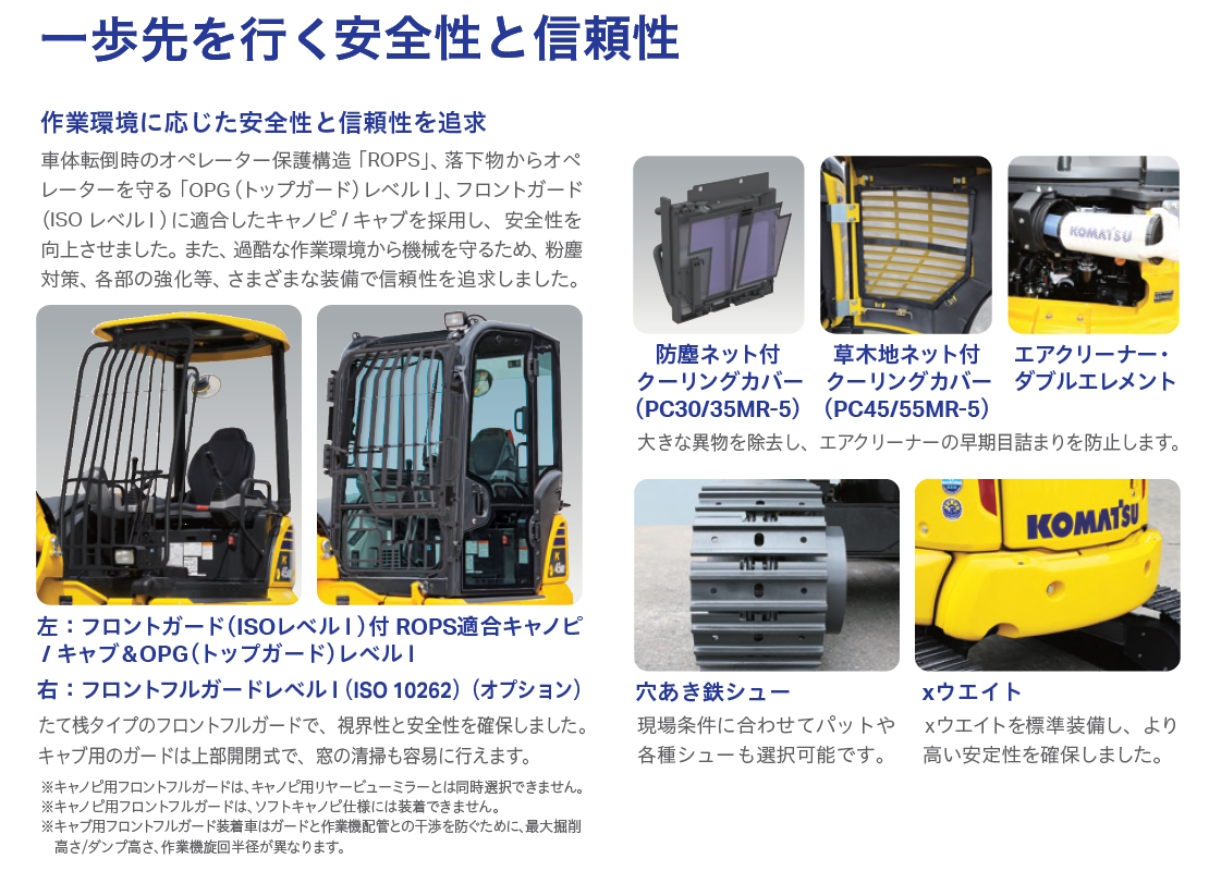 車体転倒時のオペレーター保護構造「ROPS」、落下物からオペレーターを守る「OPG(トップガード)レベルⅠ」、フロントガード(ISO レベルⅠ)に適合したキャノピ/キャブを採用し、安全性を向上。