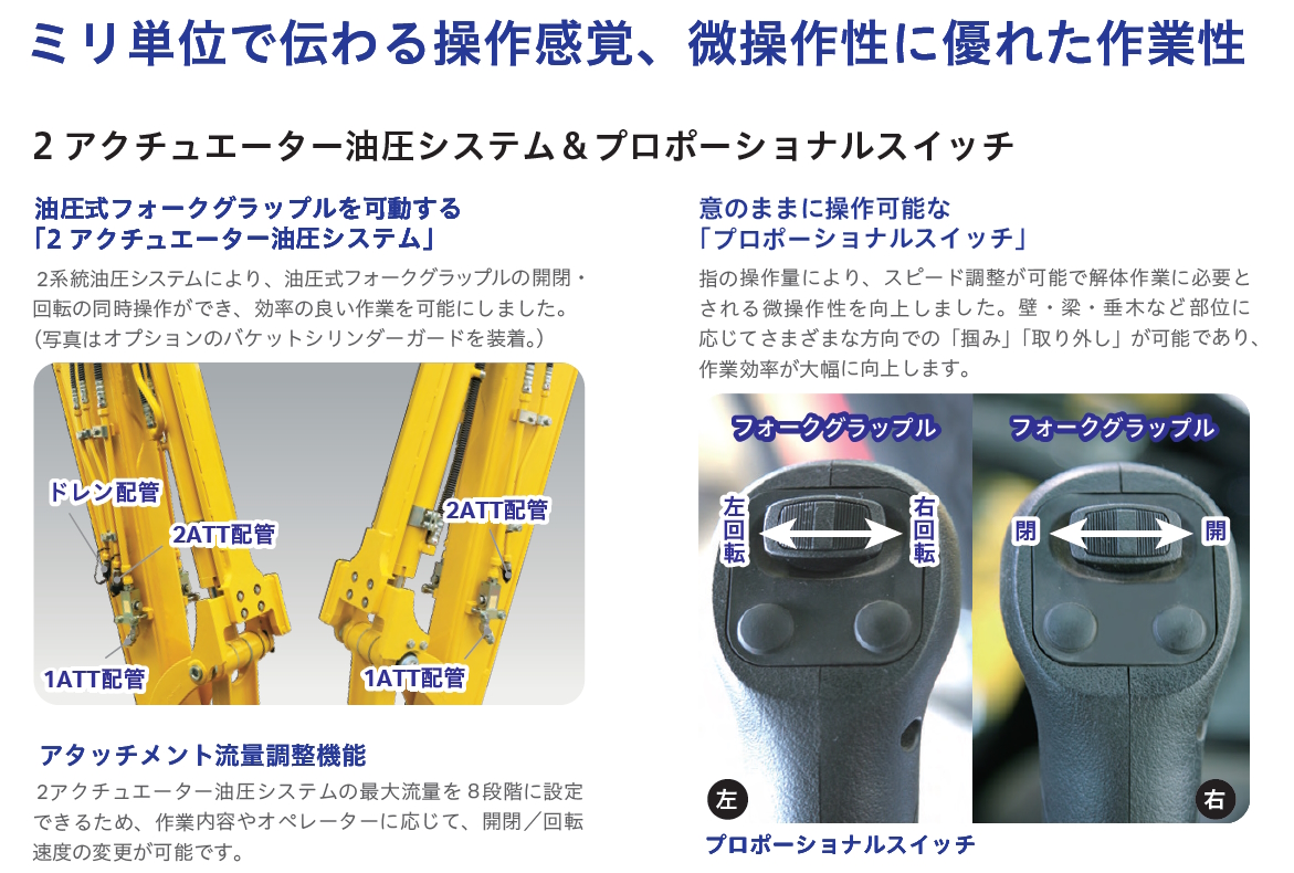 指の操作量により、スピード調整が可能で解体作業に必要とされる微操作性を向上。