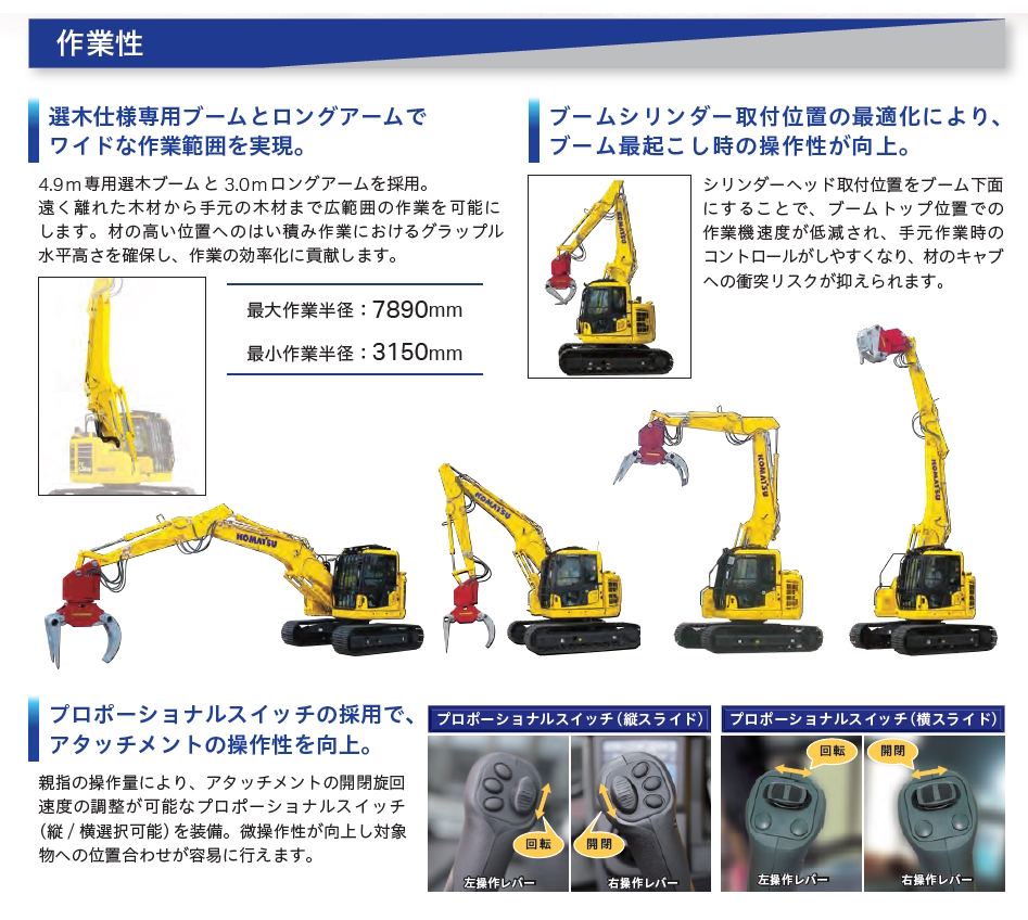 貯木場や木材市場でのハンドリングに特化した独自の専用設計で、手元から遠くまでの幅広い作業範囲を実現