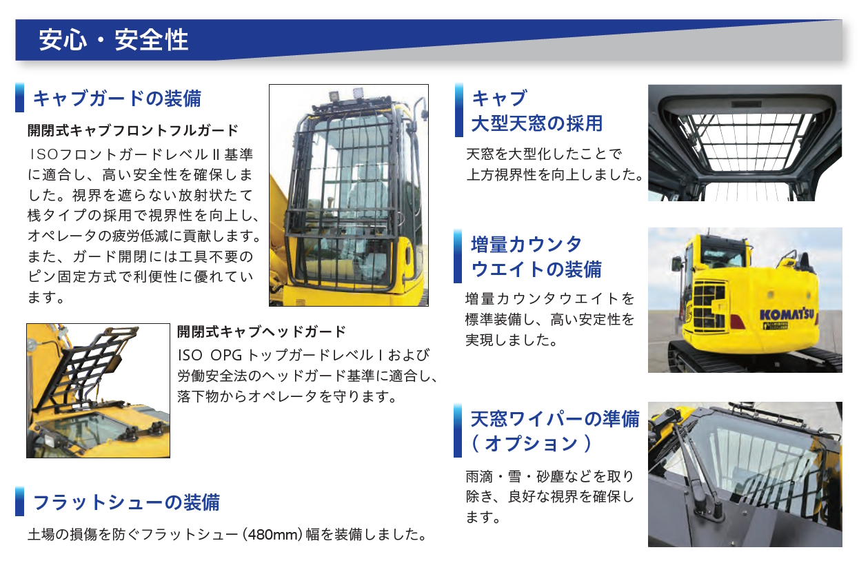 - ISOフロントガードレベルⅡ基準適合の開閉式キャブフロントフルガード採用