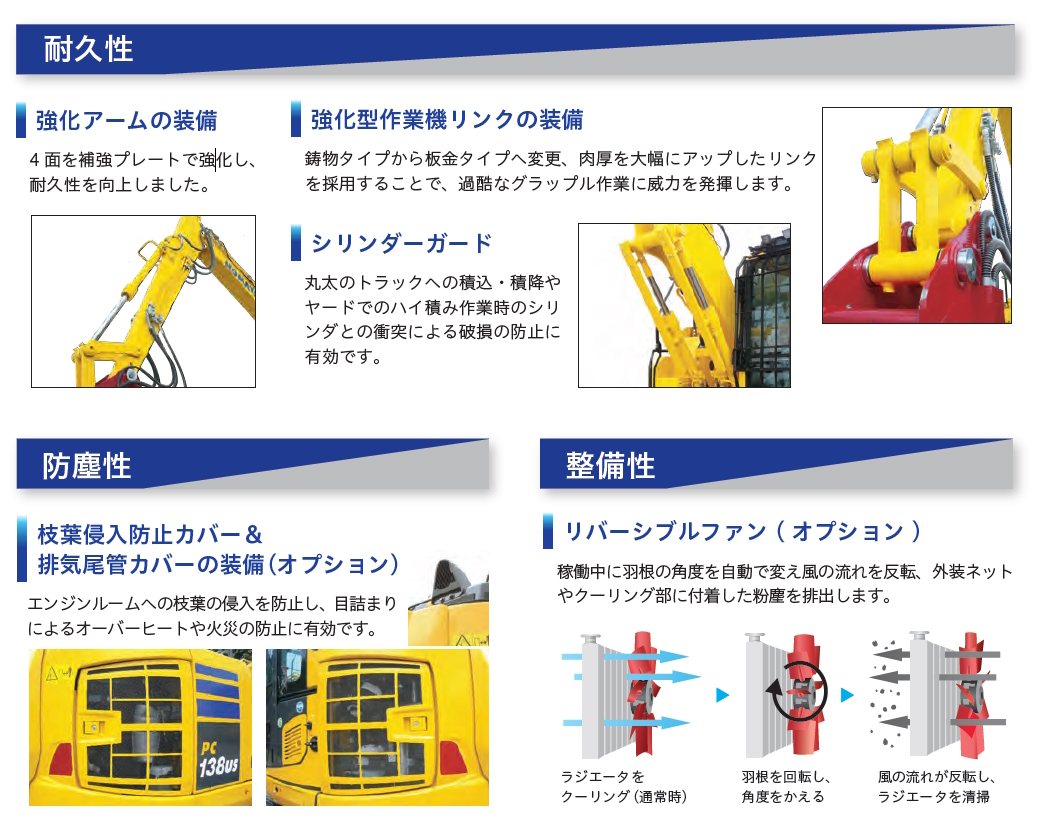 - 稼働中にエンジン冷却用の羽根の角度を自動で変え風の流れを反転可能なリバーシブルファン(オプション)を装備可能