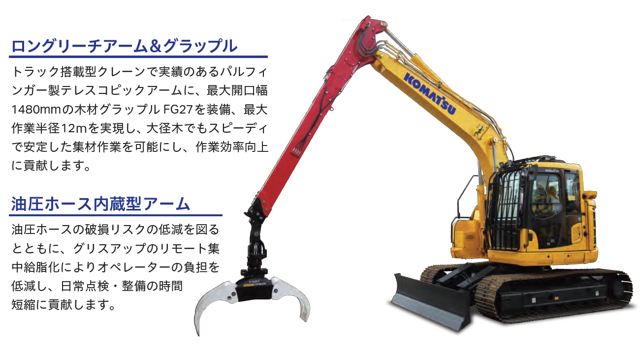 伸縮可能なテレスコピック式ロングアーム&グラップルの採用で、広範囲の集材作業を実現し、作業効率向上に貢献する専用機