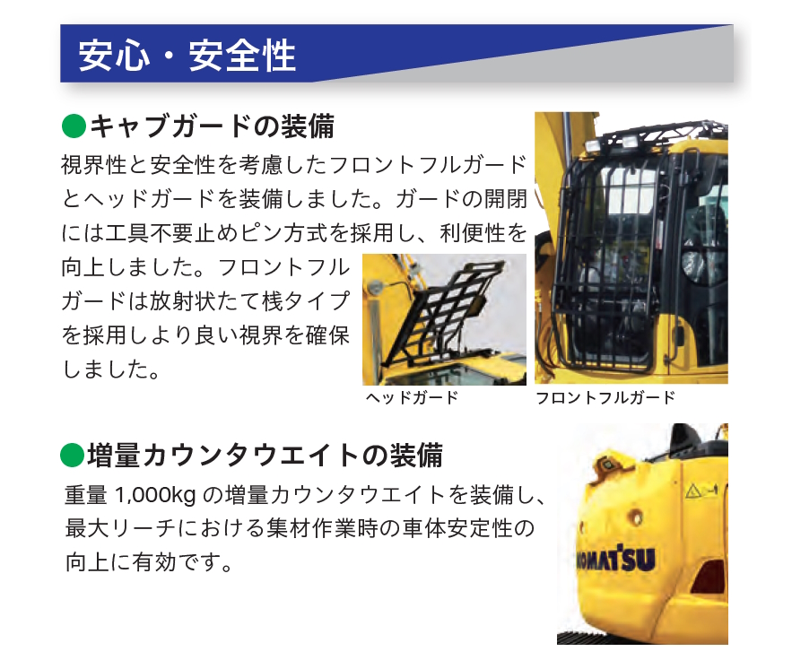 厚さ6mm のレボフレーム強化アンダーカバーの装備により、木や枝などの突き上げからエンジンや油圧機器などの損傷を防止