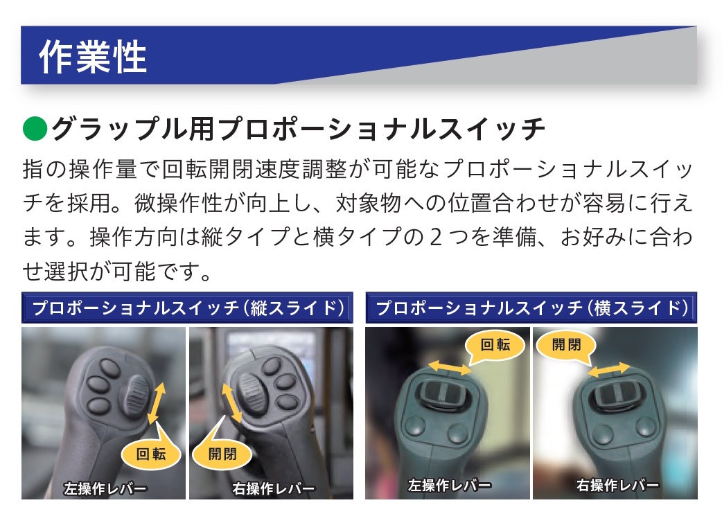 指の操作量で回転開閉速度調整が可能なプロポーショナルスイッチを採用。微操作性が向上し、対象物への位置合わせが容易に可能