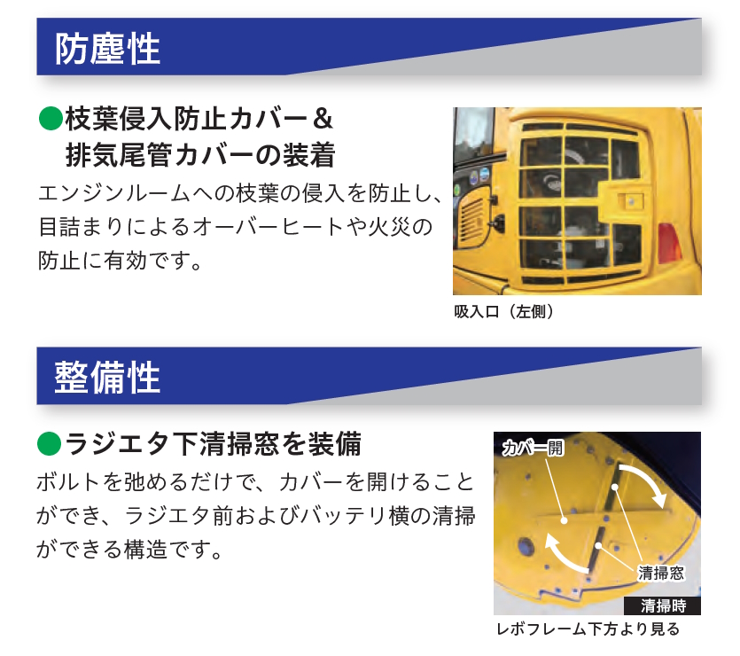 ラジエーター下清掃窓の装備により、ボルトを弛めるだけで、カバーを開けることができ、ラジエーター前およびバッテリー横の清掃が可能