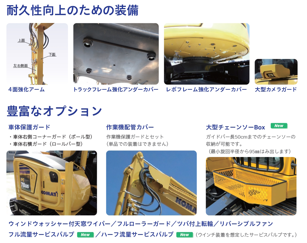 車体保護ガード、作業機配管カバー、大型チェーンソーBox、ウィンドウォッシャー付天窓ワイパー、フルローラーガード、ツバ付上転輪、リバーシブルファン、フル流量サービスバルブ、ハーフ流量サービスバルブ 等