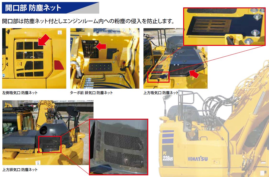開口部は防塵ネット付としエンジンルーム内への粉塵の侵入を防止します。