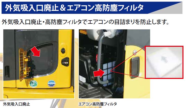 エアコンの外気吸入口を廃止し、高防塵フィルタを採用。エアコンの目詰まりを防止します。