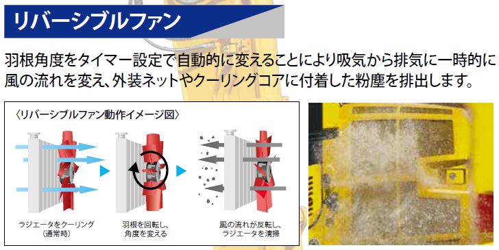 リバーシブルファンを標準装備。羽根の角度をタイマー設定で自動的に変えることにより、吸気から排気に一時的に風の流れを変え、外装ネットやクーリングコアに付着した粉塵を排出します。