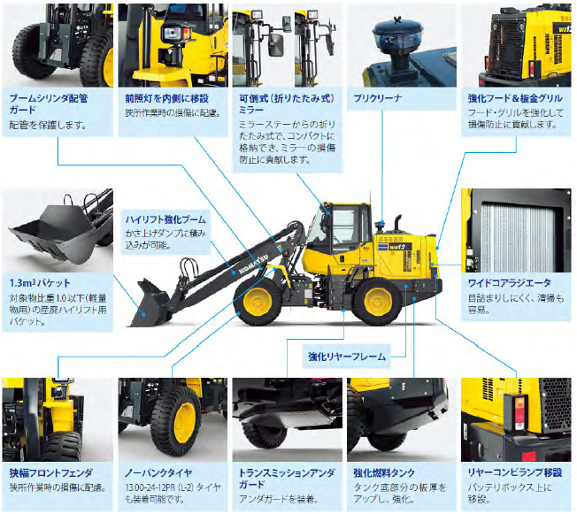 前照灯およびリヤーコンビランプの車体内側への移設、狭幅フロントフェンダの採用により、狭所での作業性を大きく向上しました。