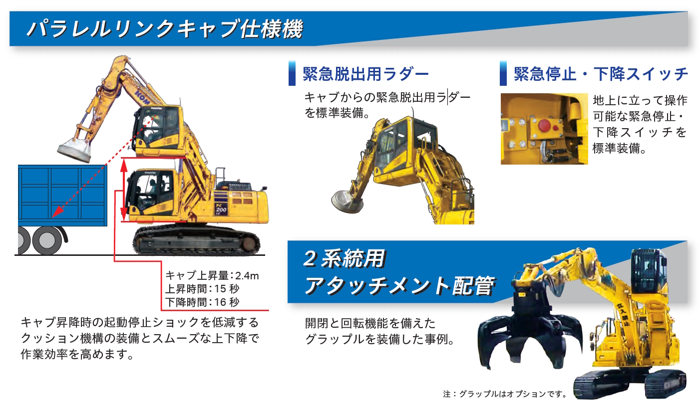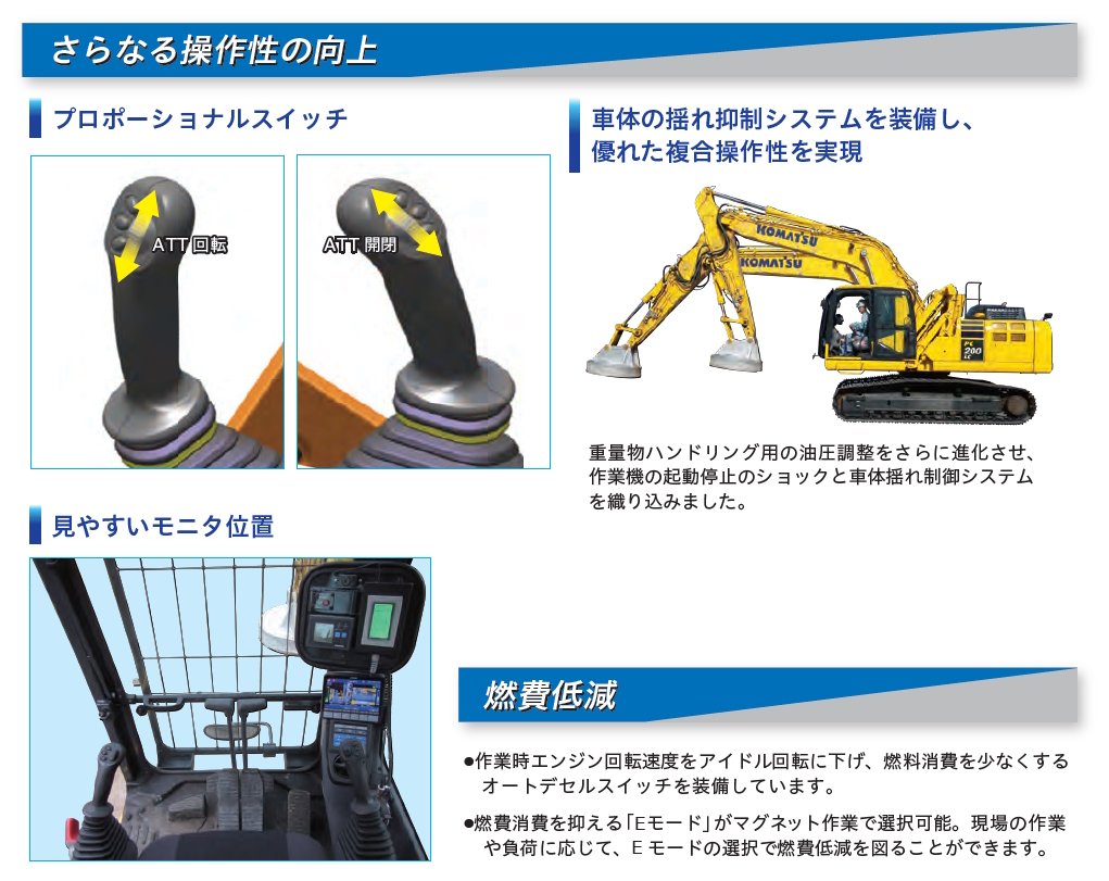 重量物ハンドリング用の油圧調整をさらに進化させ、作業機の起動停止のショックと車体揺れ制御システムを織込みました。