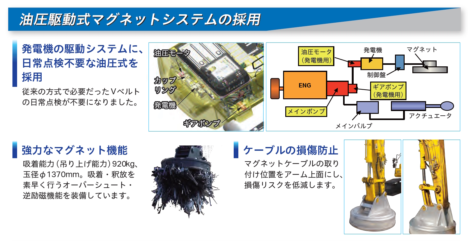 発電機の駆動システムに、日常点検不要な油圧駆動式を採用。従来の方式で必要だったVベルトの日常点検が不要となりました。