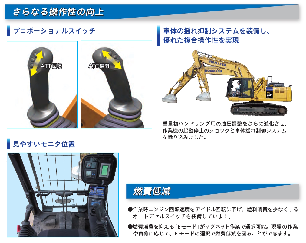 重量物ハンドリング用の油圧調整をさらに進化させ、作業機の起動停止のショックと車体揺れ制御システムを織込みました。
