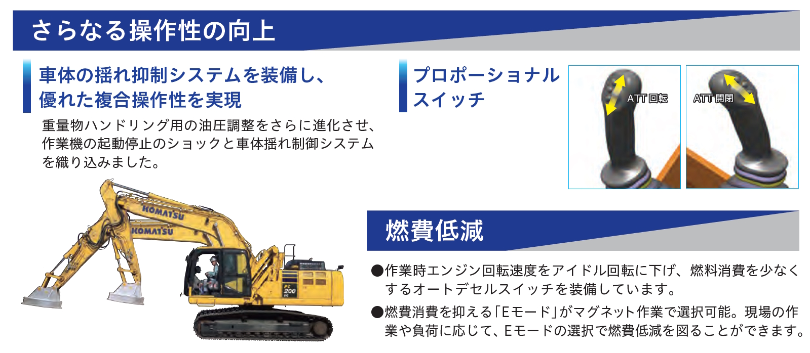 重量物ハンドリング用の油圧調整をさらに進化させ、作業機の起動停止のショックと車体揺れ制御システムを織込みました。