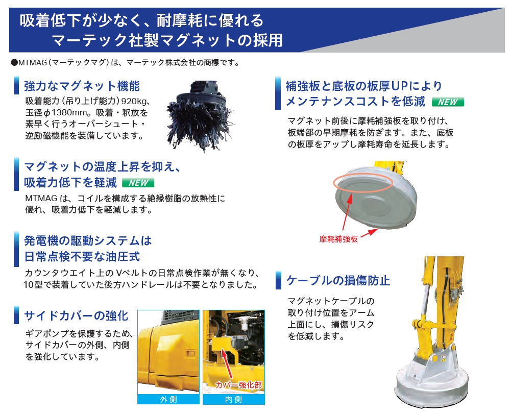 MTMAG(マーテックマグ)は、コイルを構成する絶縁樹脂の放熱性に優れているため、マグネットの温度上昇を抑え、吸着力低下を軽減します。また、マグネットの前後に摩耗補強板を取り付け、板端部の早期摩耗を防ぎます。さらに、底板の板厚をアップし、摩耗寿命を延長します。