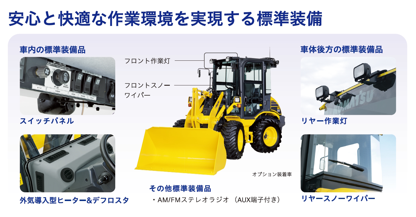 フロント/リヤー作業灯、フロント/リヤースノーワイパー、外気導入型ヒーター&デフロスタ、AM/FMステレオラジオ(AUX端子付き)を標準装備。