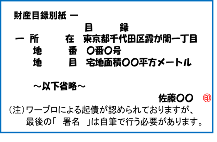 たとえば、パソコンで作成した財産目録や、不動産の登記事項証明書、預金通帳のコピーなどを添付することが可能です。
