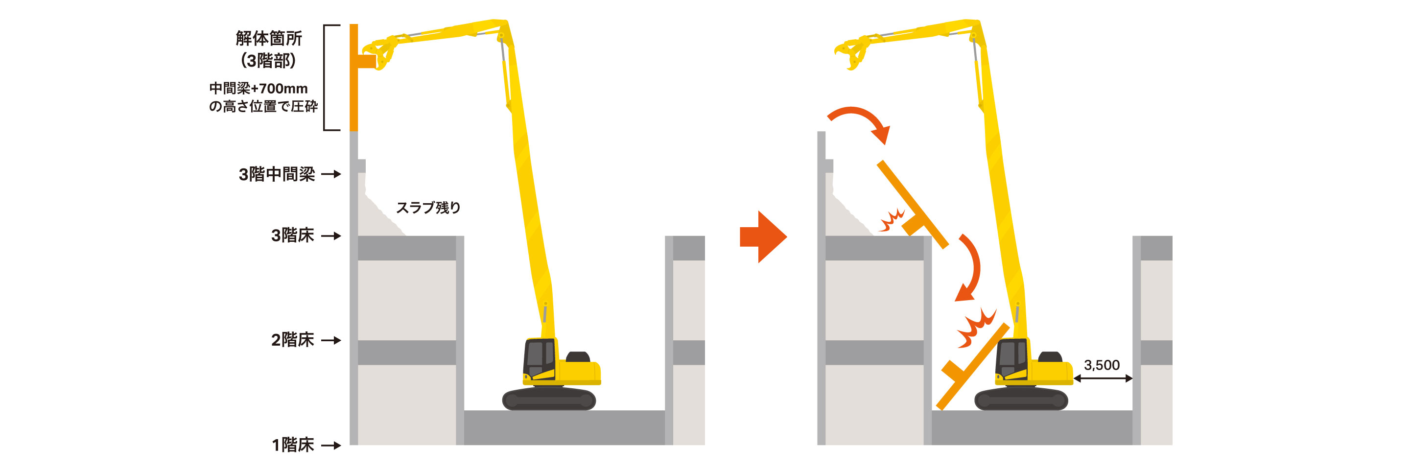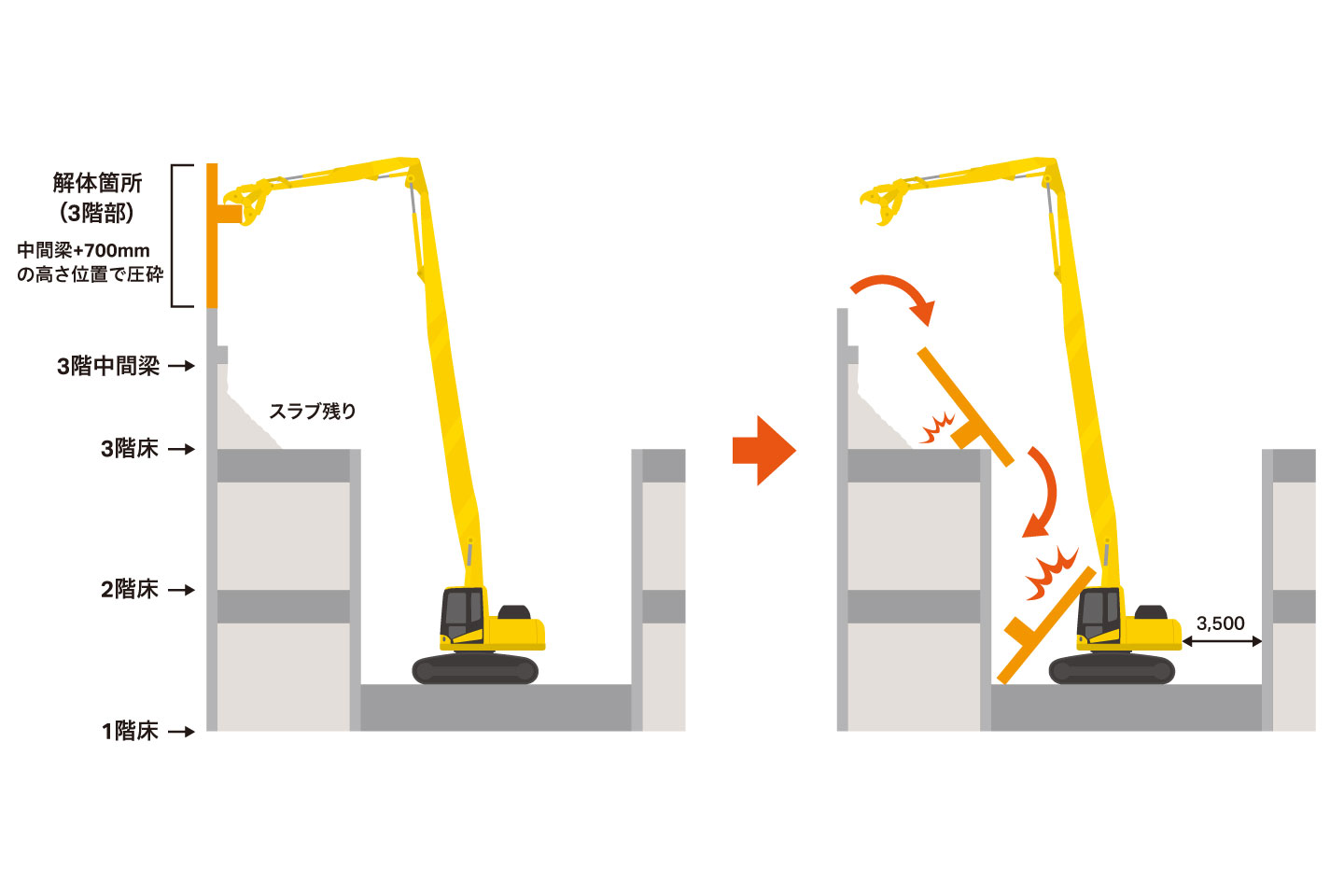 ロングブームを取り付けた重機を使用して、工場本体建屋の南側3階躯体コンクリートを縁切りし、重機を設置している内部側に倒す作業中、3階の位置に留まっている予定の コンクリート塊が鉄筋に付着されたまま突然崩れ、下層の躯体に当たりながら跳ね、重機運転席に飛来・落下した。