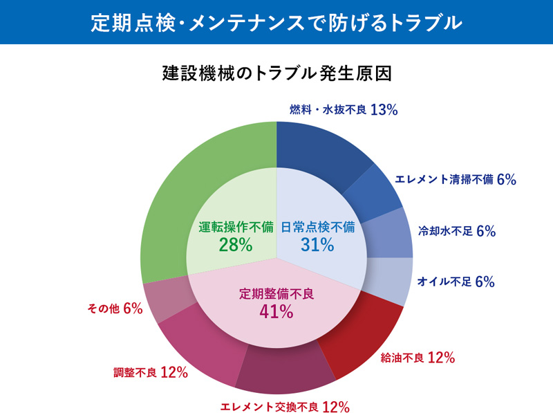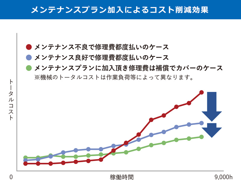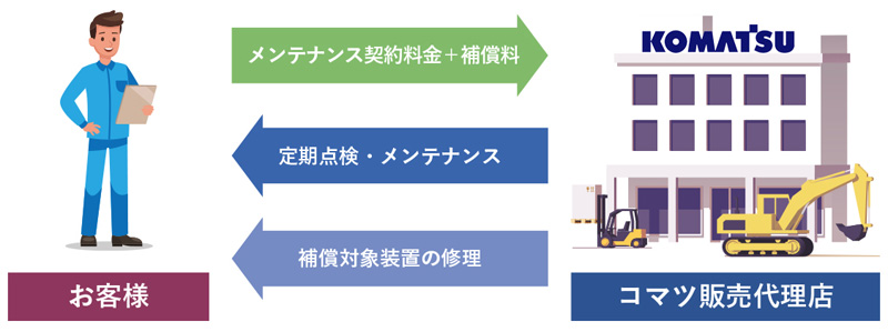 コマツ販売代理店が、取扱説明書の記載に基づく定期点検・メンテナンスを代行し、補償対象装置が故障した場合の修理費は補償制度から支払われます。
