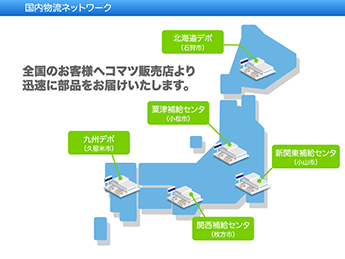 当社の製品は、日本国内のみならず世界中で24時間365日稼働を続けています。お客様の機械稼働をサポートするために、消耗部品、修理部品といった補給部品を、3補給センタ、2デポ体制で迅速かつ正確にお届け致します。